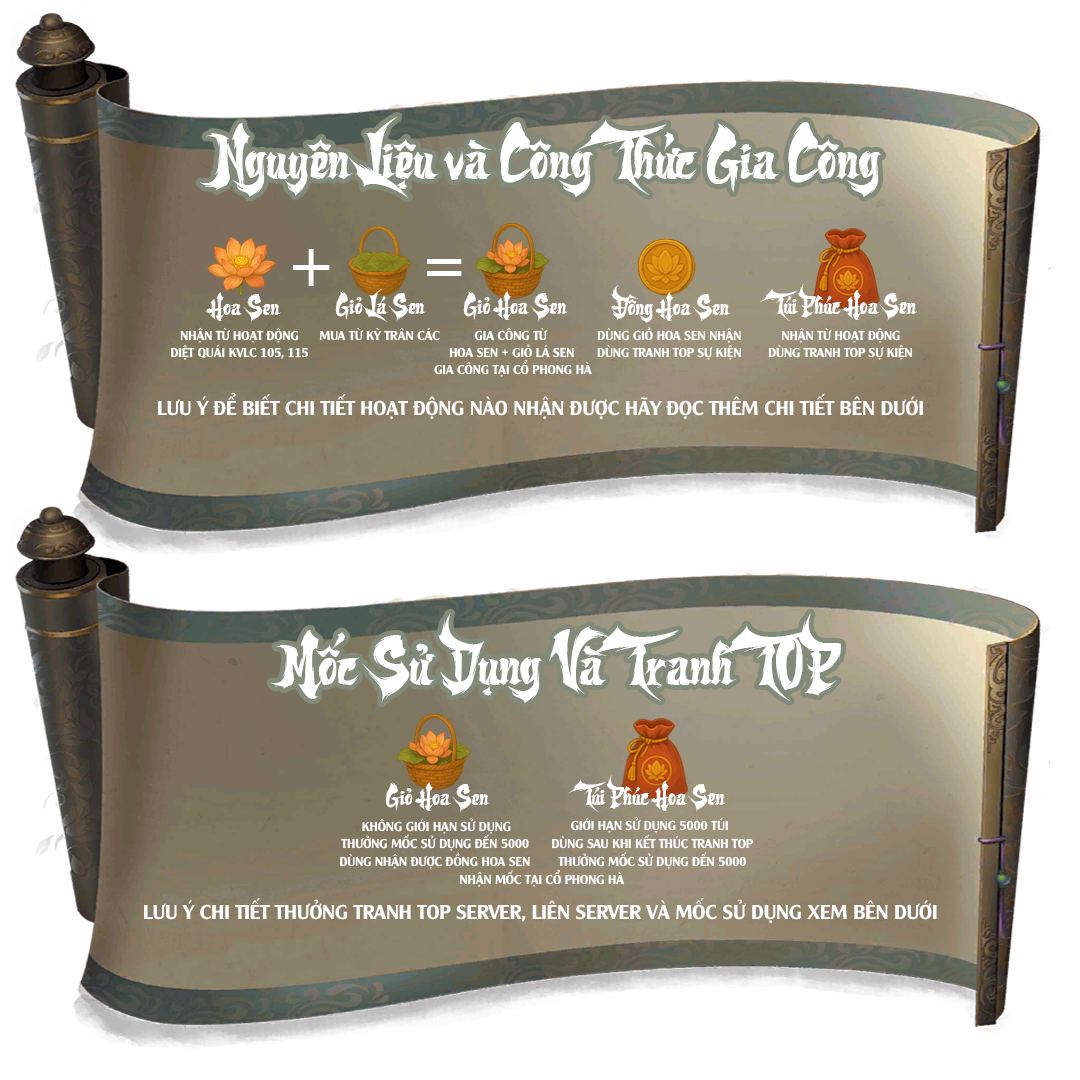 | Túi Phúc Hoa Sen Công dụng dùng để tranh TOP sự kiện và sử dụng nhận thưởng | Vượt ải Quân Doanh (Mỗi lần thành công 10) Vượt ải Gia Tộc (Mỗi lần thành công 40) Truy Nã Hải Tặc (Mỗi lần thành công 6) Hoàn thành 50 nhiệm vụ Bao Vạn Đồng (30) Qua tầng Bạch Hổ Đường (Tầng 1 - 10, Tầng 2 - 20, Tầng 3 - 30) Đoán Hoa Đăng (Đáp đúng câu hỏi 2) Tham gia Chiến Trường Tống Kim (Mỗi trận 20, Trận 21:00 nhận được nhân đôi tức 40) Tham gia Loạn Phái (Tham gia nhận được 100) |